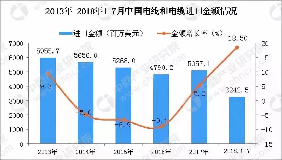 2018年1-7月中国电线和电缆进口数量及金额增长率情况入下图所示: