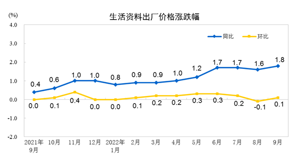 2022年9月份,全国工业生产者出厂价格同比上涨0.9%,环比下降0.1%;工业生产者购进价格同比上涨2.6%,环比下降0.5%。1—9月平均,工业生产者出厂价格比去年同期上涨5.9%,工业生产者购进价格上涨8.3%。